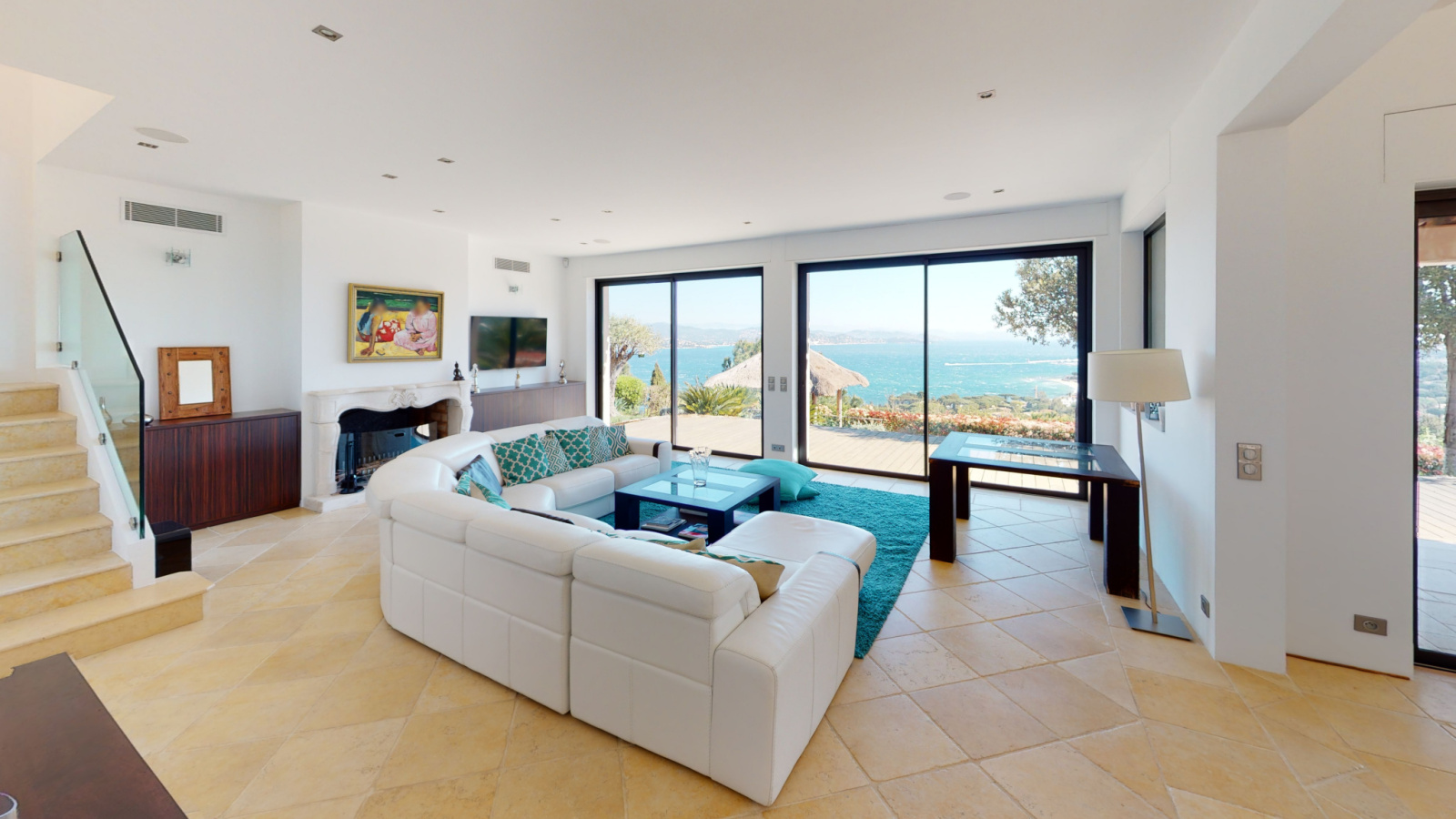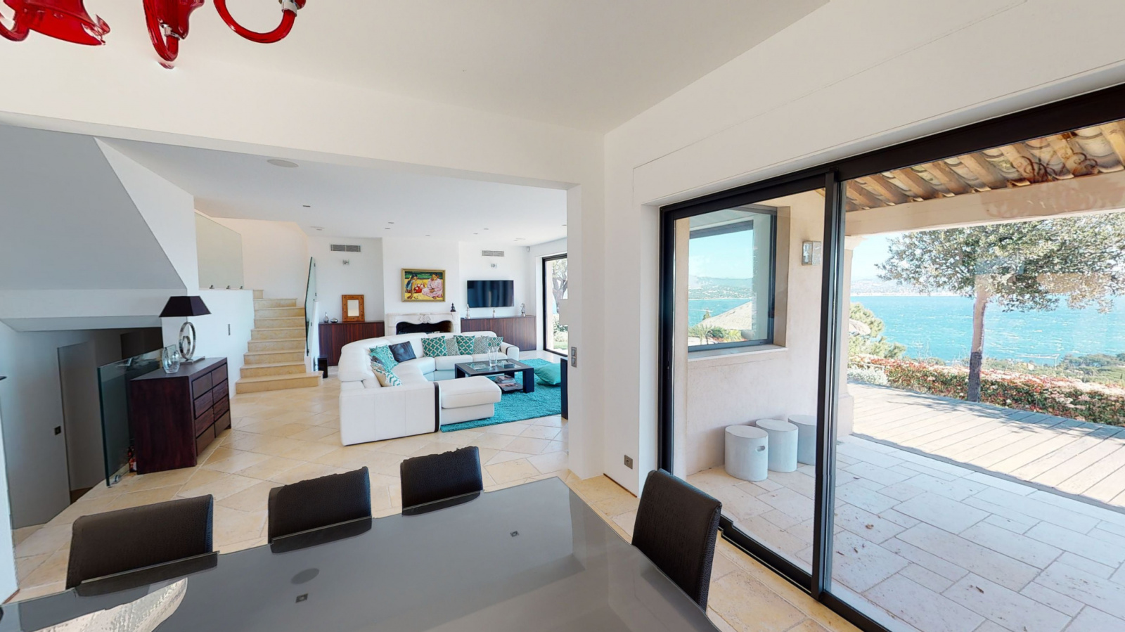 Le séjour de 60 m² avec une vue mer et une salle à manger pour 12 personnes avec un accès à la terrasse couverte pour apprécier et contempler la mer depuis la propriété.