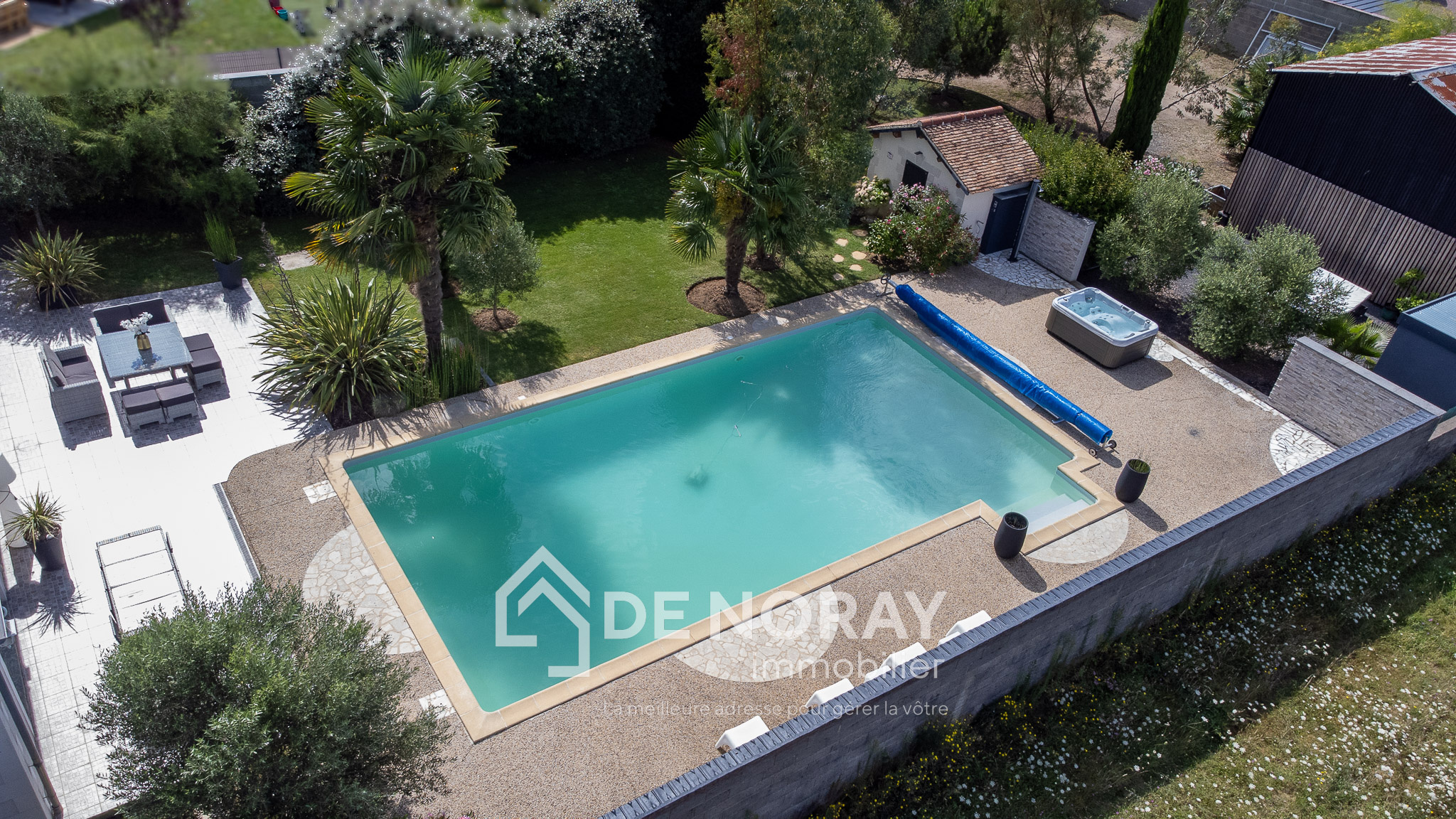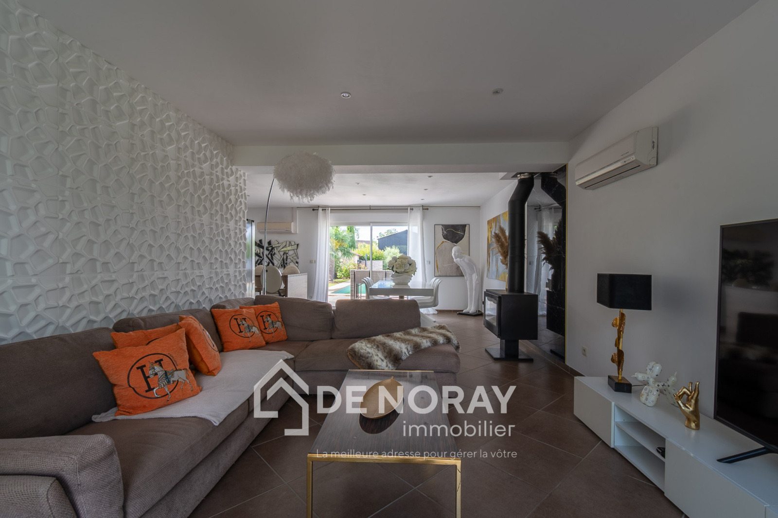 La pièce de vie, spacieuse et traversante, regroupe le salon, la salle à manger et une cuisine entièrement équipée avec des matériaux haut de gamme, le tout ouvrant sur une vaste terrasse ensoleillée et une piscine maçonnée de 12x6 mètres, idéale pour profiter des beaux jours.