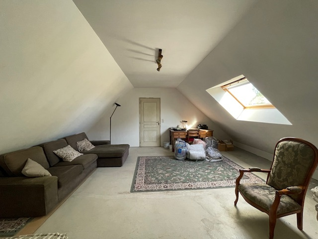 L'étage lui se compose d'une très grande chambre de près de 40m² au sol, d'une pièce à aménager et d'un grenier.