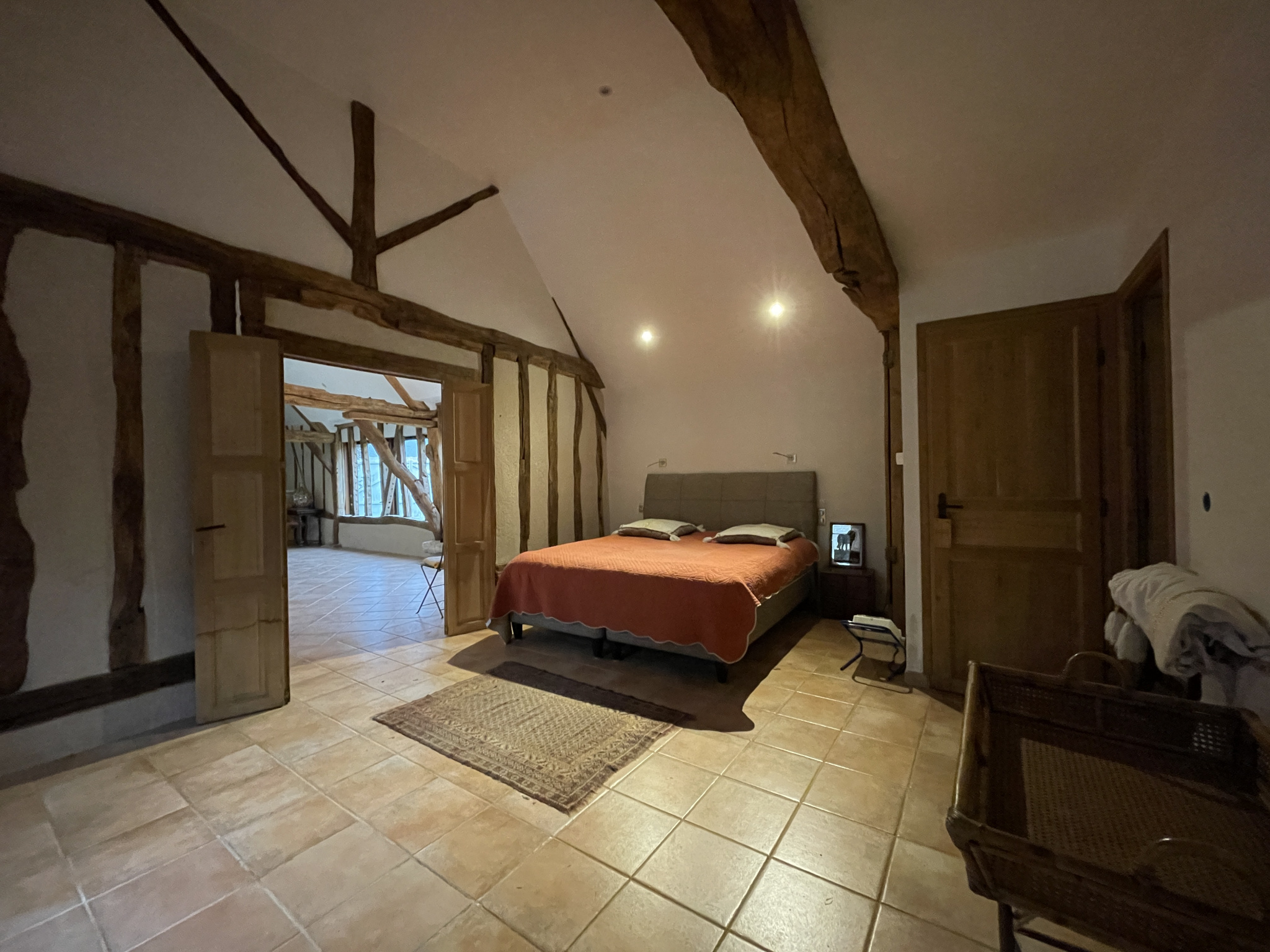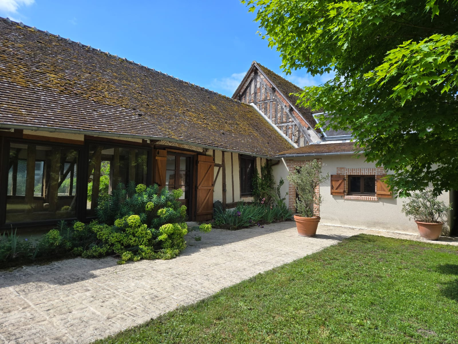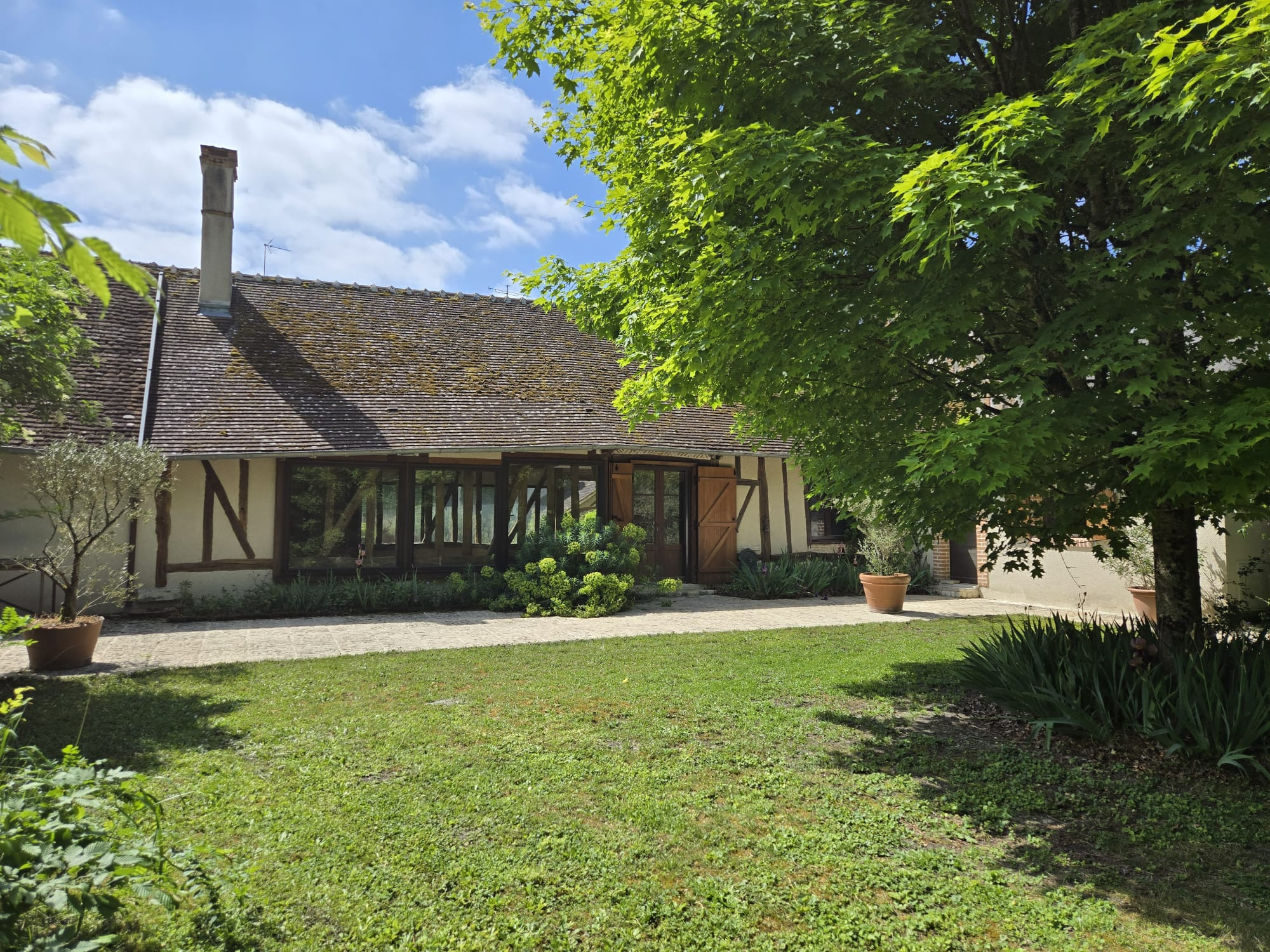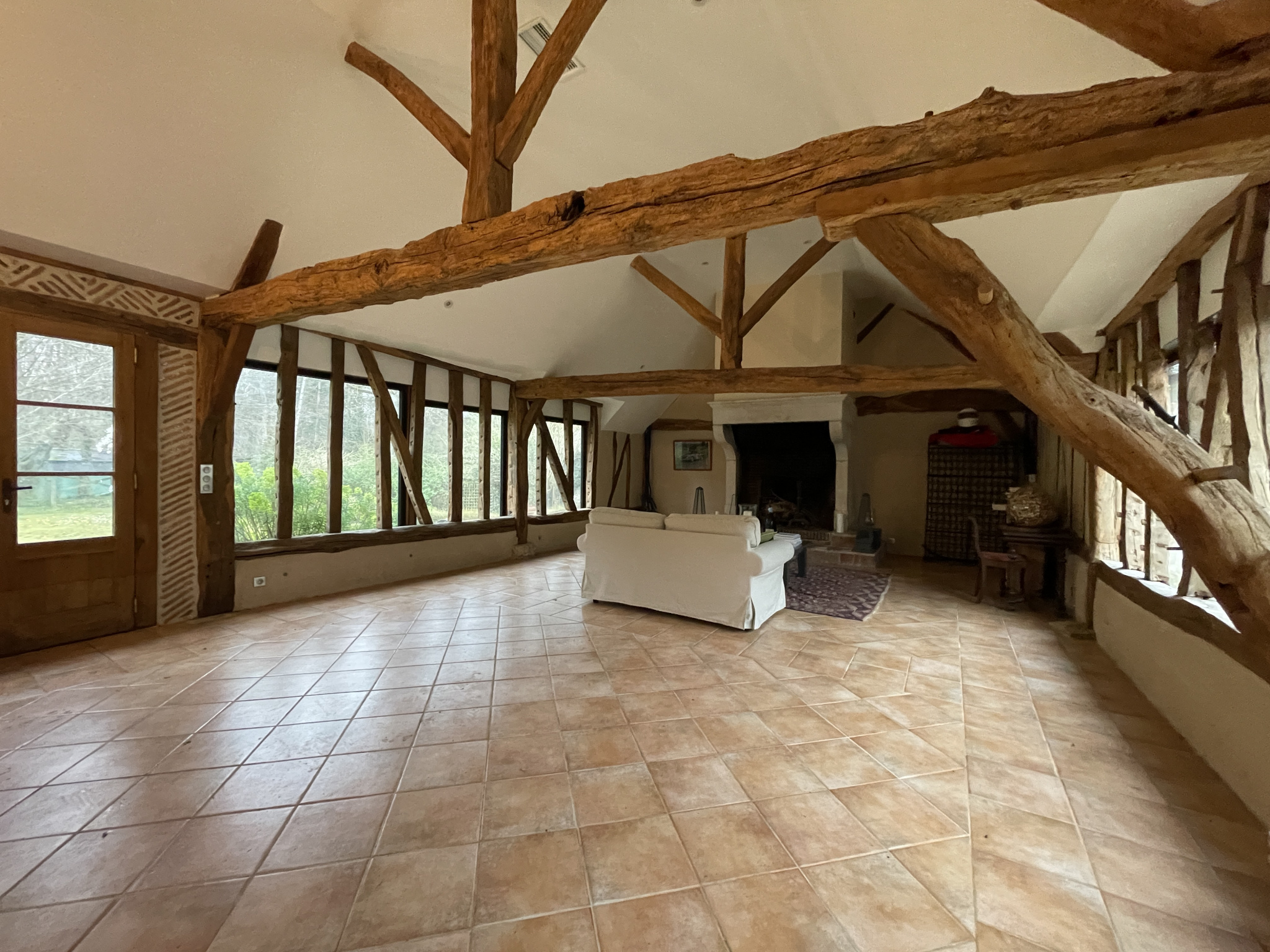 Longère de 110 m² pleine de charme : poutres, colombages, cheminée monumentale, grandes baies vitrées, climatisation réversible