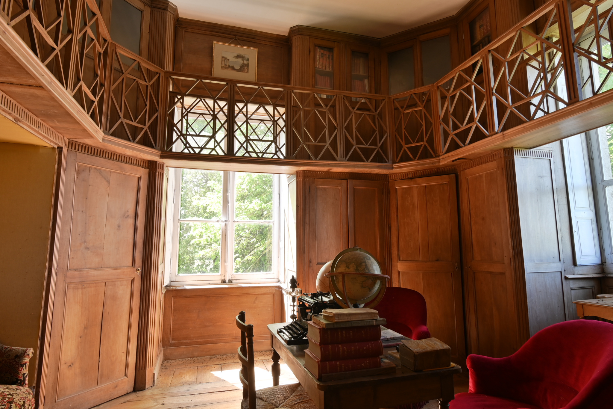 Un magnifique escalier en bois mène à l’étage où se trouvent 4 chambres supplémentaires ainsi qu’une superbe bibliothèque.