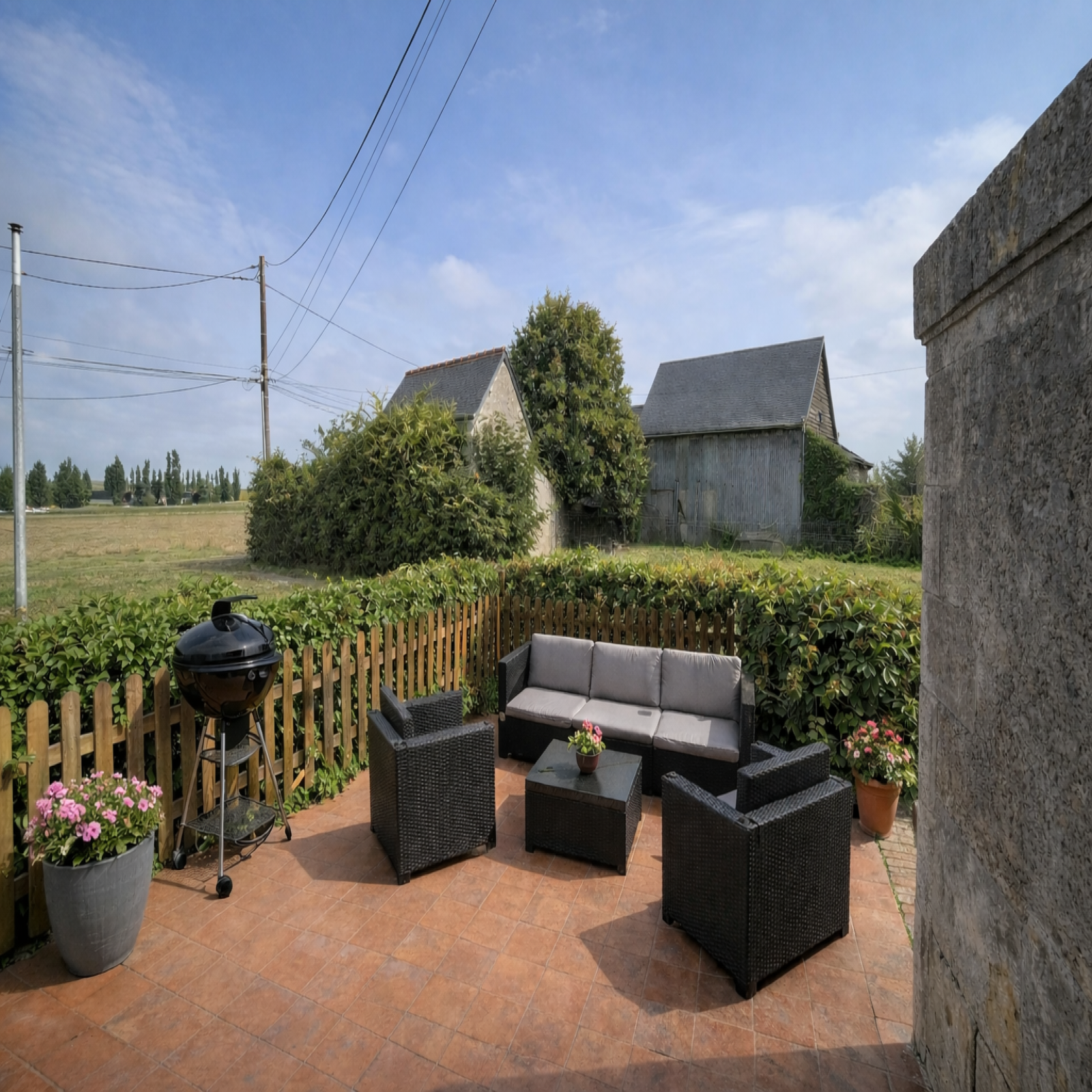Vous bénéficierez également d’une dépendance type grange, offrant de nombreuses possibilités : garage, atelier ou espace de stockage.
